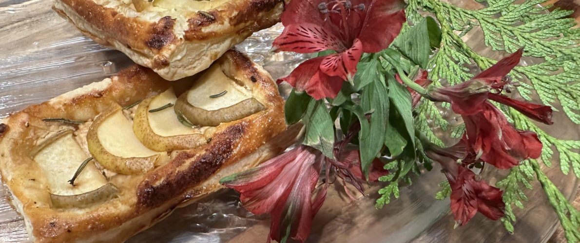 - Layer thin pear slices across the pastry (on top of the goat cheese)